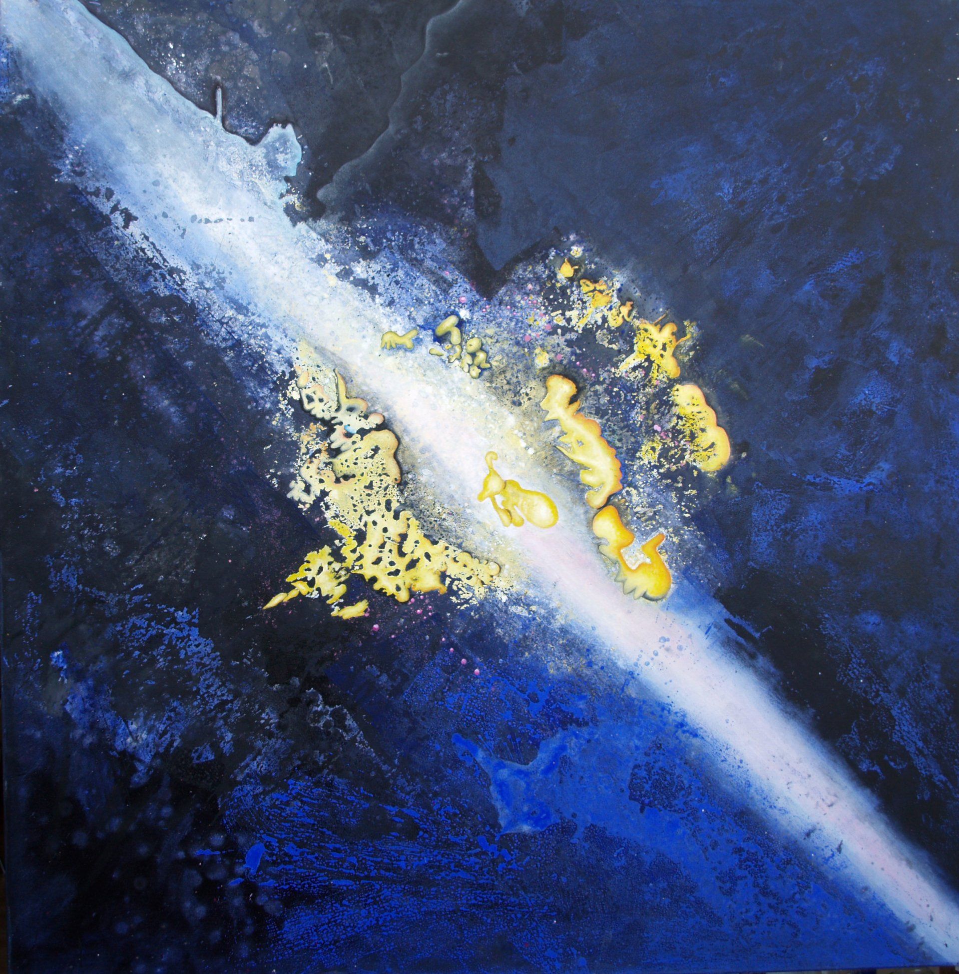 Und dazwischen immer wieder das Zurückfinden zu den eigenen Ursprüngen, zurück zum Abstrakten, zur konkreten Malerei wie damals, Jahrzehnte her, auf der Berliner Kunstakademie. In diesem Kontext erscheinen die blauen Farborgien, die bisweilen ins Rote und Pinke abdriften, nicht mehr als ungegenständlich, sondern können als Liebe und Hass, als Zorn und Zweifel, als lüsterne, tabubrechende Momente weiblicher Lebensenergie gelesen werden. Alles bleibt in Bewegung.